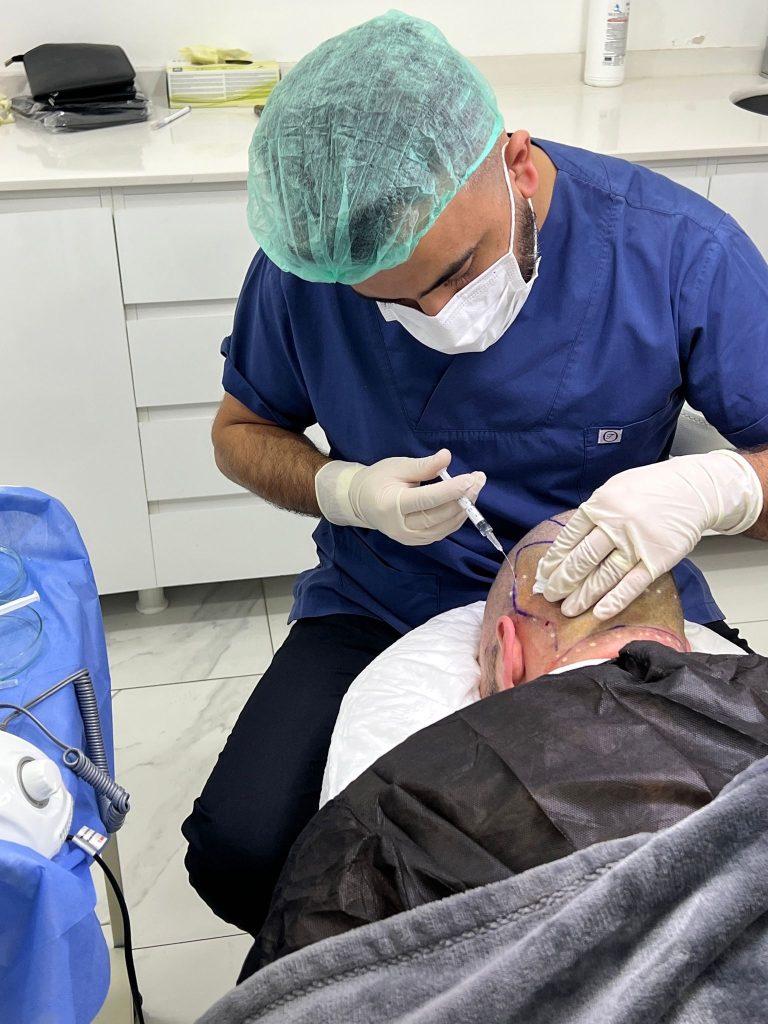 Saç nakli operasyonunun konforlu ve ağrısız geçebilmesi için Dermojet adı verilen ağrısız anestezi cihazı ile püskürtme yöntemi uygulanarak foliküler ünitelerin alınacağı donör alanın uyuşması sağlanır. Ardından ağrısız anestezinin etkisini arttırmak ve daha uzun süreli olmasını sağlamak için lokal anestezi işlemi ile anestezi uygulaması tamamlanır.